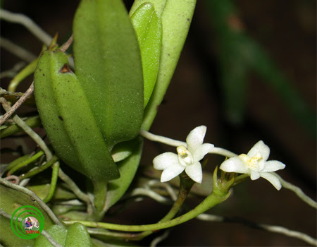 Mô Tả: Lan sống phụ sinh, nhỏ, thân dài 4 - 6cm, nhiều rễ chống. Lá 2 dãy, thuôn hẹp, dài 4 - 7cm, rộng 1cm, đỉnh chai 2 thùy tròn không đều. Cụm hoa trên đốt rụng lá, dài bằng lá. Hoa lớn 1cm, màu trắng. cánh môi có đốm màu nâu và vàng cam, chia 3 thùy, hai thùy bên đứng có lông, nở chiếc một vào cuối Đông, đầu Xuân.